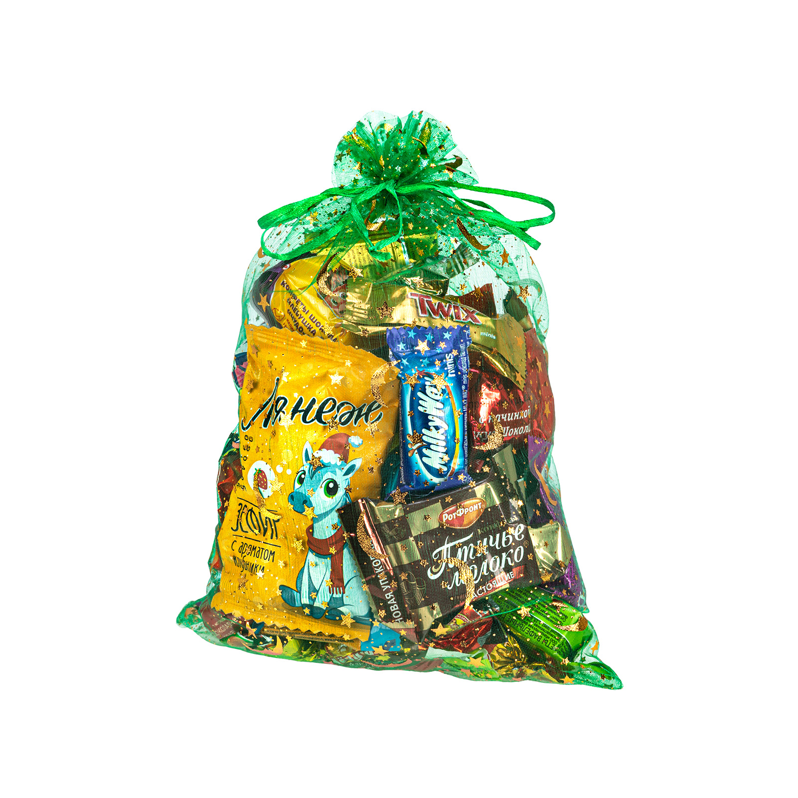 Новогодние сладкие подарки в текстильном мешочке - универсальный выбор, если речь идет о новогоднем празднике в школе или детском саду. “Лунная ночь” - это компактный бюджетный подарочный набор, упакованный в зеленый текстильный мешочек, сверху надежно перевязанный веревочкой. В состав подарка входит входит 500 грамм разнообразных кондитерских изделий на любой вкус: желе, бисквиты, батончки, шоколадные конфеты и многое другое. Также в мешочке можно найти небольшой памятный сувенир в виде символа наступающего года - очаровательной грациозной лошадки.