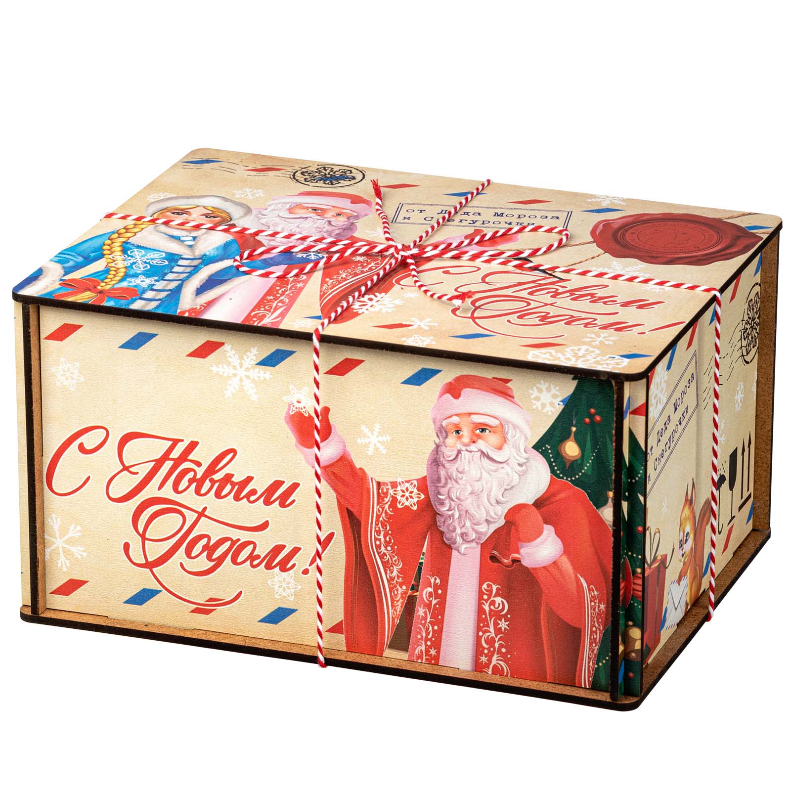 Интересный вариант новогоднего подарка – «Посылка из Устюга (Полезный состав)». Он представлен в разделе Дерево. Отлично подойдет на подарок в 2026 году с символом Лошадь. Внутри такого презента находится кондитерский набор весом 1000 граммов.